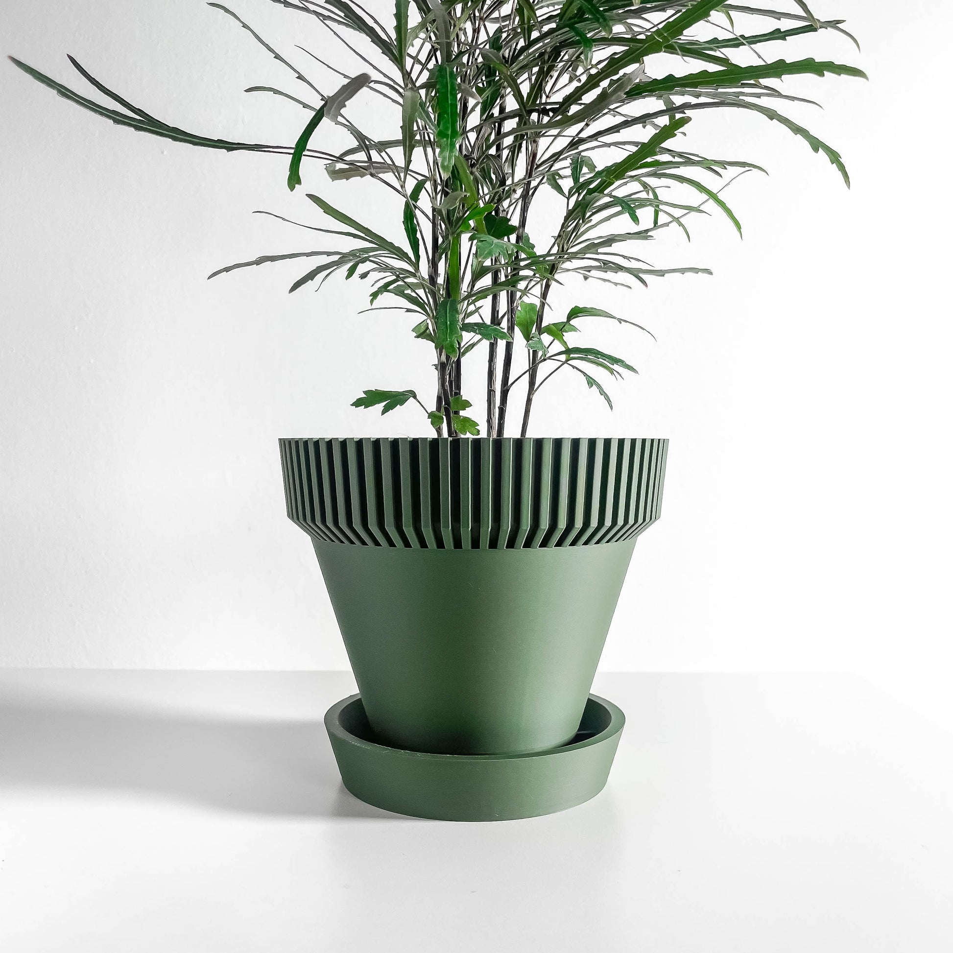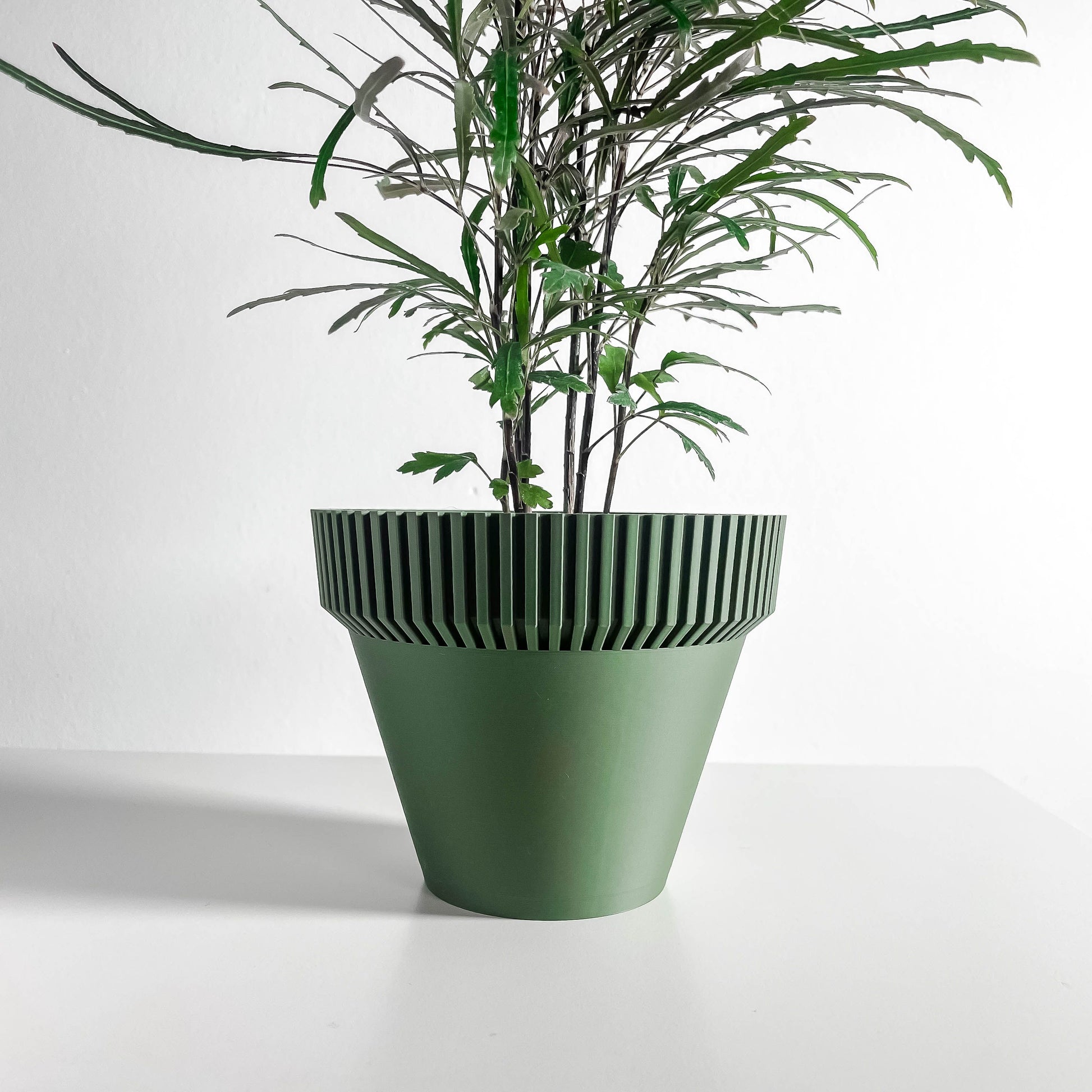 Material PLA Bioplastic and a smooth matte finish. Available in rich colors like olive green and midnight black. Offered in multiple sizes from small to xxl to suit tabletop, windowsill, and shelf styling. Lightweight and durable for indoor use, with careful layer refinement for a clean appearance.