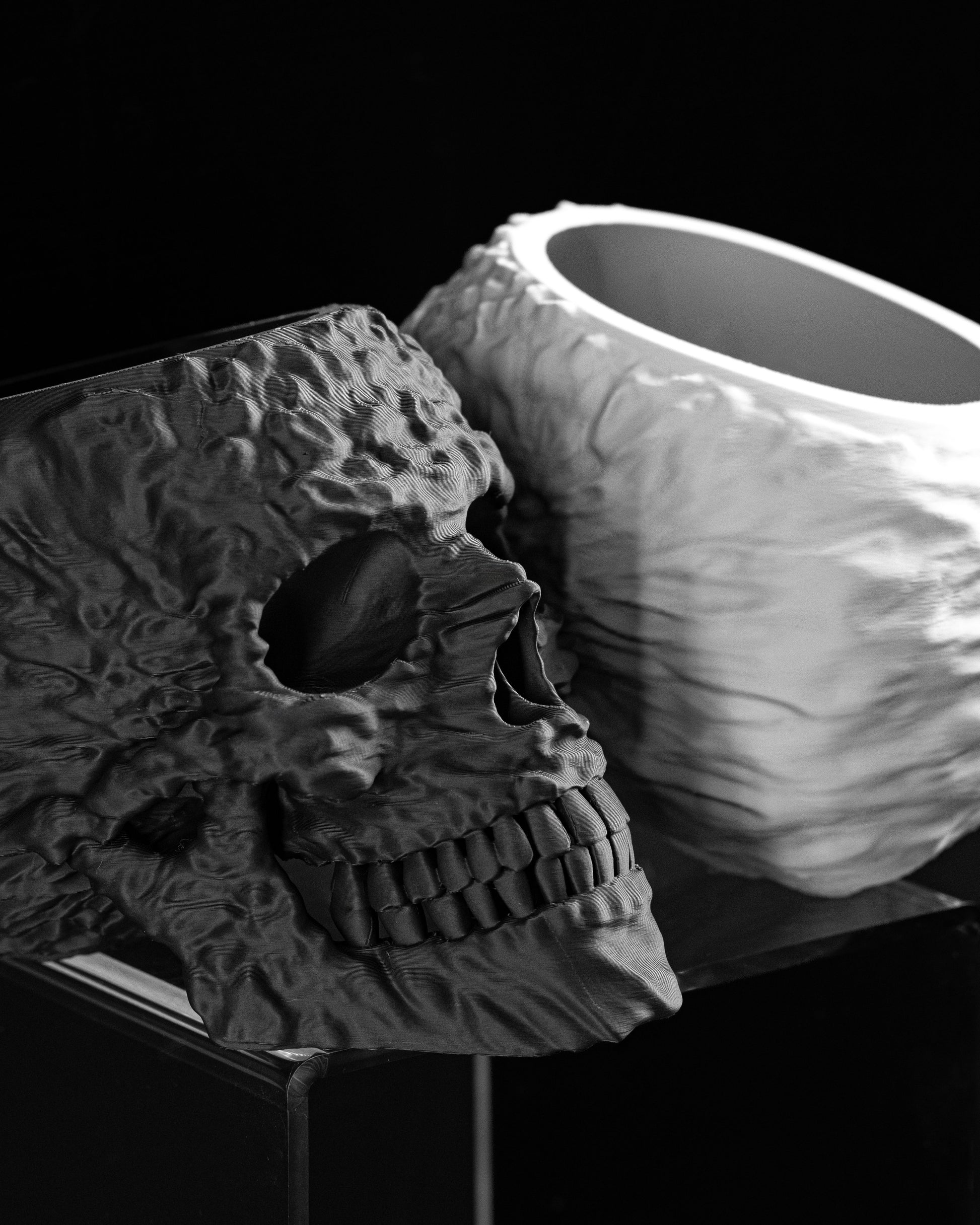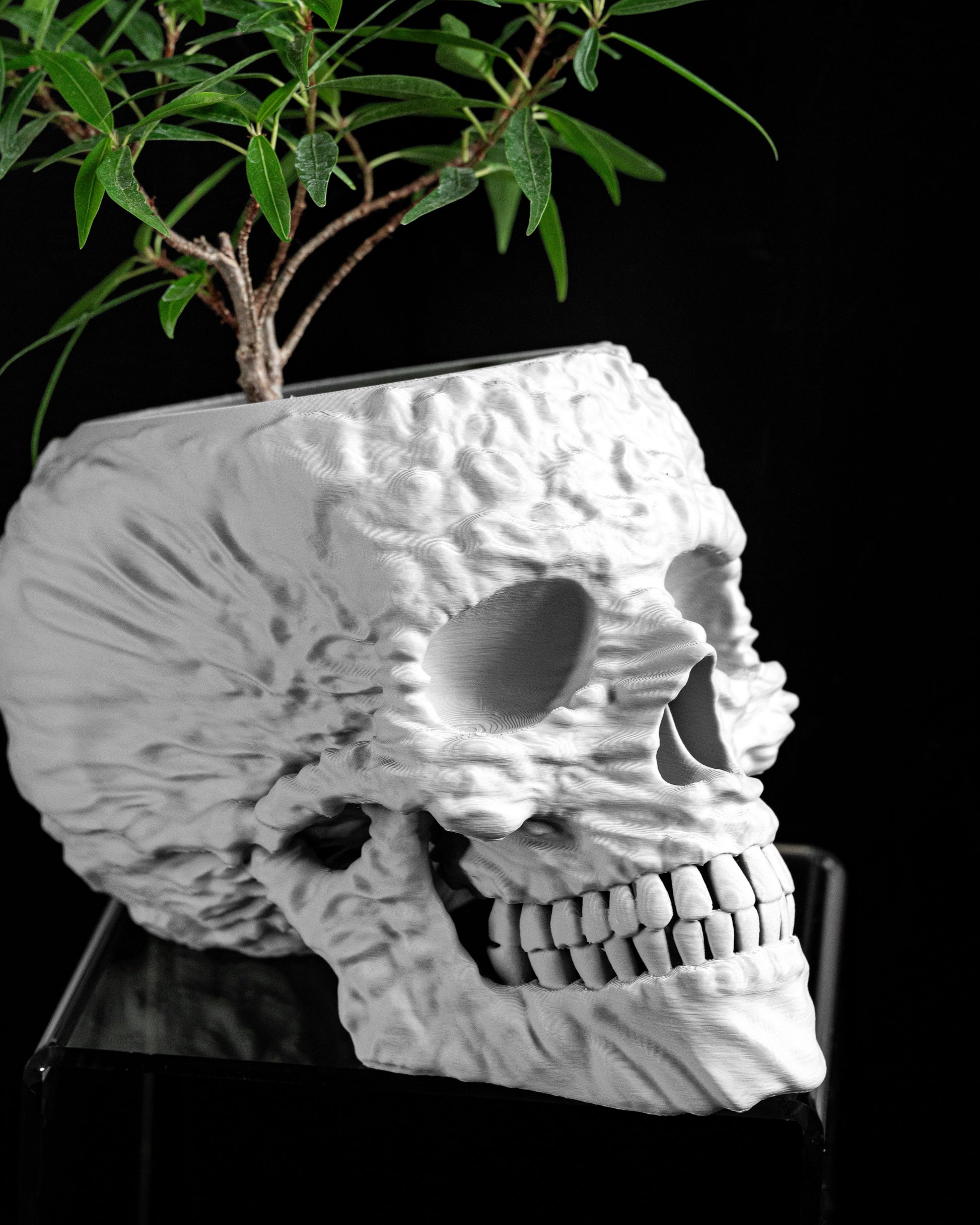 This skull planter brings gothic charm and functional flair to shelves and desks, 3D printed.