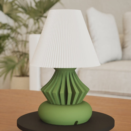 Brighten your bedside or desk with a sculptural table lamp that blends Art Deco curves and Scandinavian calm, 3D printed. This modern table lamp delivers a warm, gentle glow ideal for reading, relaxing, or focused work. It carries a unique character and precise craftsmanship while using eco-friendly PLA Bioplastic for a thoughtful lighting choice.