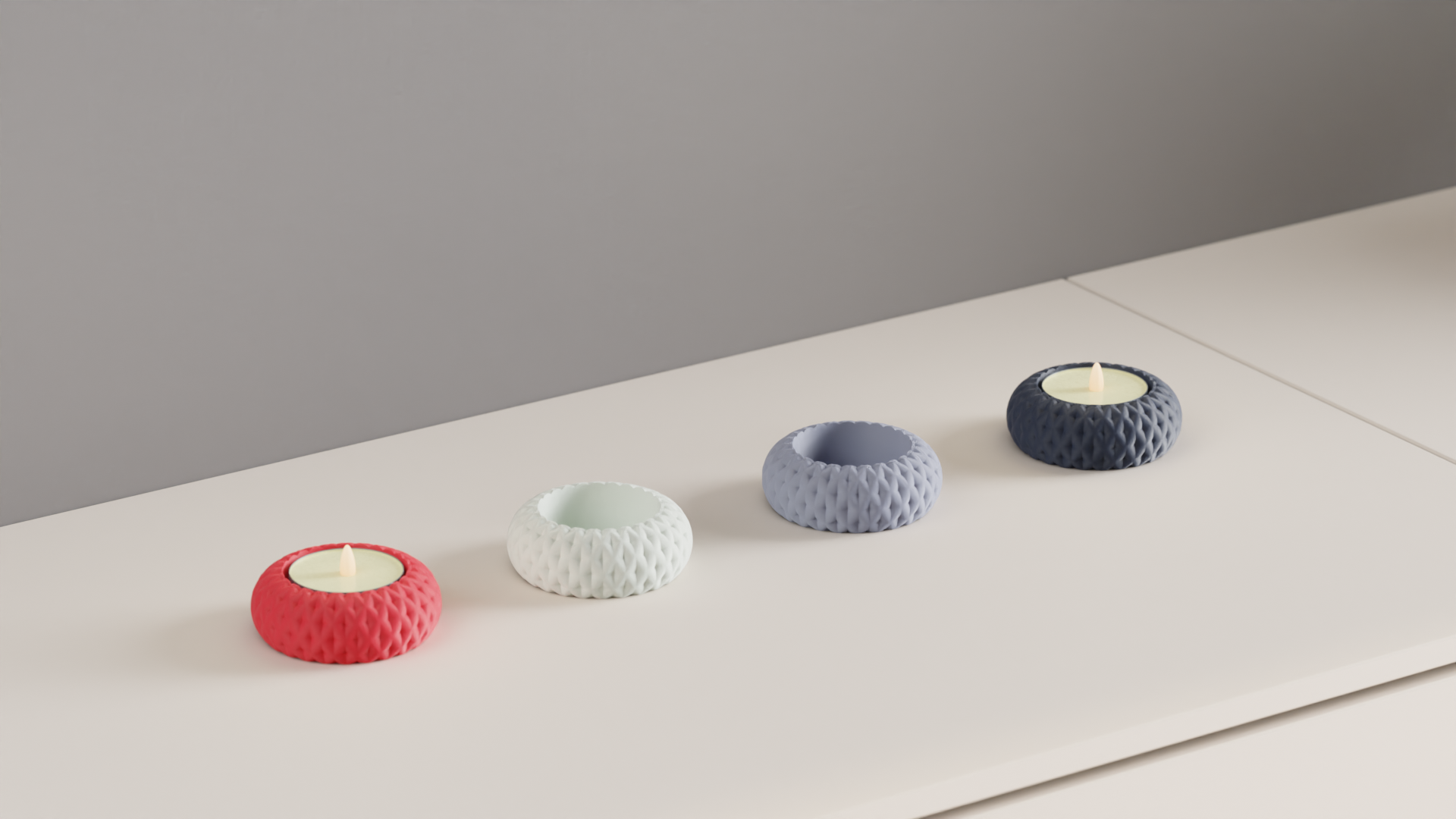 Elevate your tabletop with a sculptural tealight holder, thoughtfully 3D printed. The basket weave geometry casts patterned shadows that create a warm, intimate glow. It blends contemporary sculptural form with cozy ambient lighting to become a subtle tabletop accent.