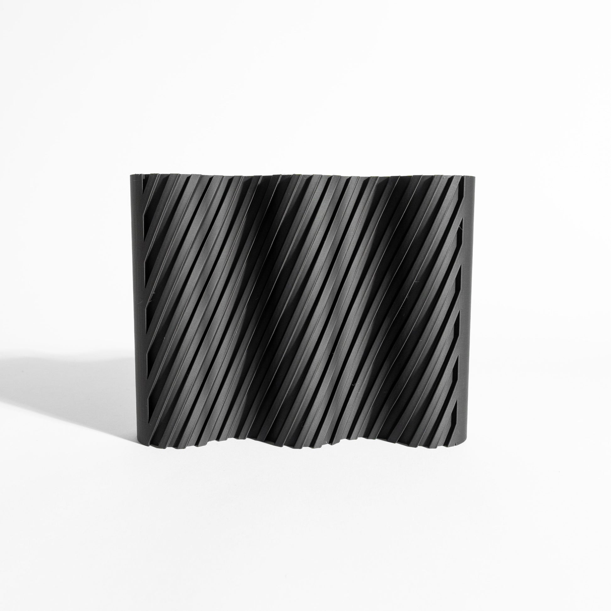 A ribbed vase brings refined height to dried stems and single blooms, 3D printed. The tall silhouette balances clean lines with tactile texture and a sculptural presence. Each piece adds a quiet architectural gesture that elevates shelves, mantels, and dining tables.